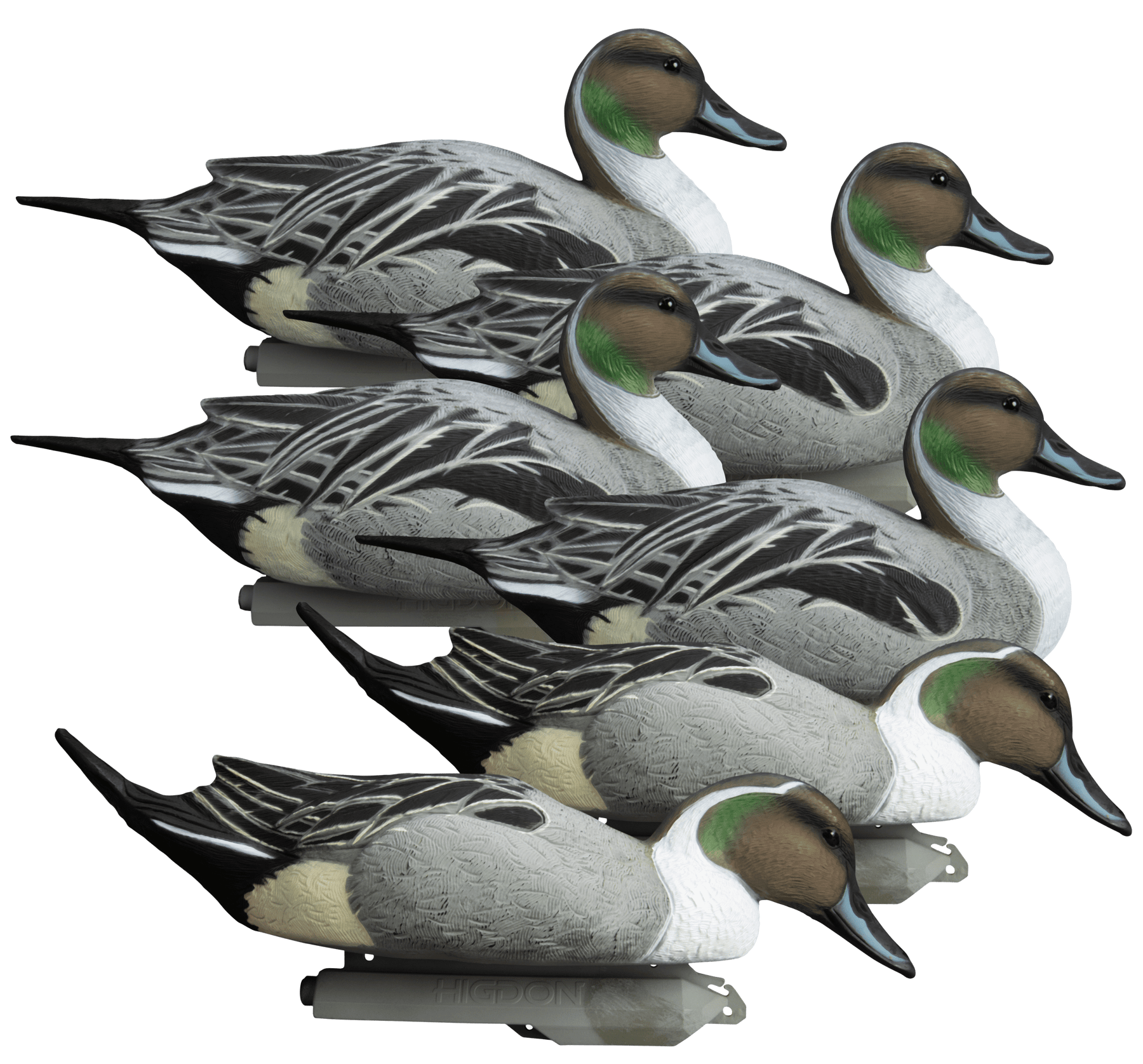 Add this big, bright, natural looking battleship all-drake pintail decoys to light up your decoy spread.The battleship is our biggest, brightest, most durable oversize decoy, perfect for hunters who want to make a huge impact in their spread and demand a lifetime of worry-free use.Higdon set the standard for foam filling and these battleships are unsinkable, so you never have to worry about shooting your decoys.Weighted, self-righting keel for quick and easy set-up.Keel allows short stringing decoys for shallow water.Our paint won't peel or fade, so your decoys will look great season after season, whether you leave your decoys out all season or pick up after every hunt.Package includes 6 duck decoys: 4 upright head drakes and 2 feeder drakes.Dimensions and weights may vary.