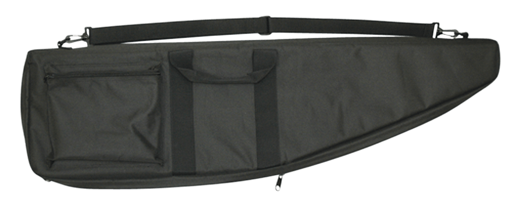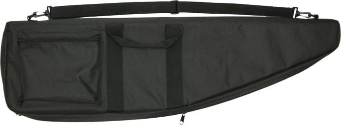 Bob allen's 36" black tactical rifle case is water resistant, made of coated poly with poly webbing and an external storage pocket (10x9).The case has self healing nylon zippers, foam padding and poly webbing carry handles and shoulder strap.