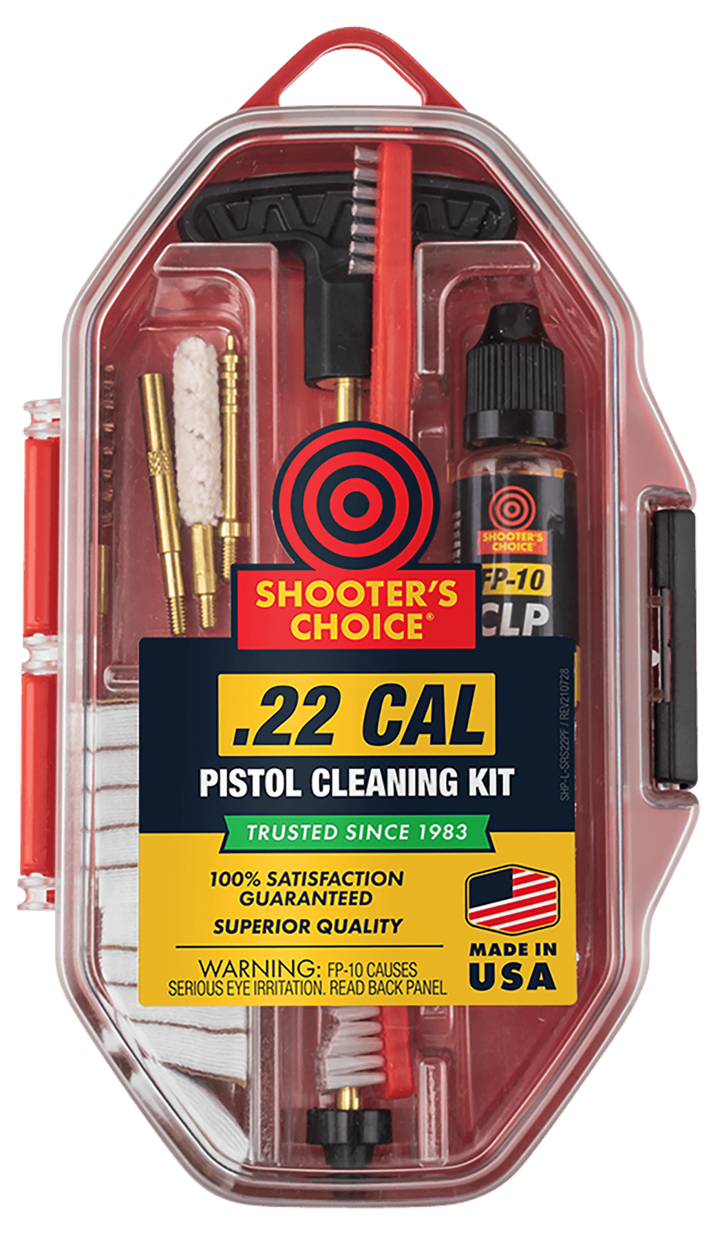 Shooters choice.22cal pistol cleaning kit contains quality brass components that wont damage your firearm while cleaning.Get everything you need to clean your.22cal pistol in one place with this gun cleaning kit.Kit contains- solid brass rod section with female 8/32 threaded end and swivel handle for easy cleaning; 2".22cal bronze bore brush; 2".22cal cotton bore mop; brass component adaptor; 100 count 1"x1" cleaning patches; nylon all-purpose cleaning brush;.22cal brass pierce point jag and 0.5 fl.Oz.Bottle of shooter's choice fp-10 elite lubricant.