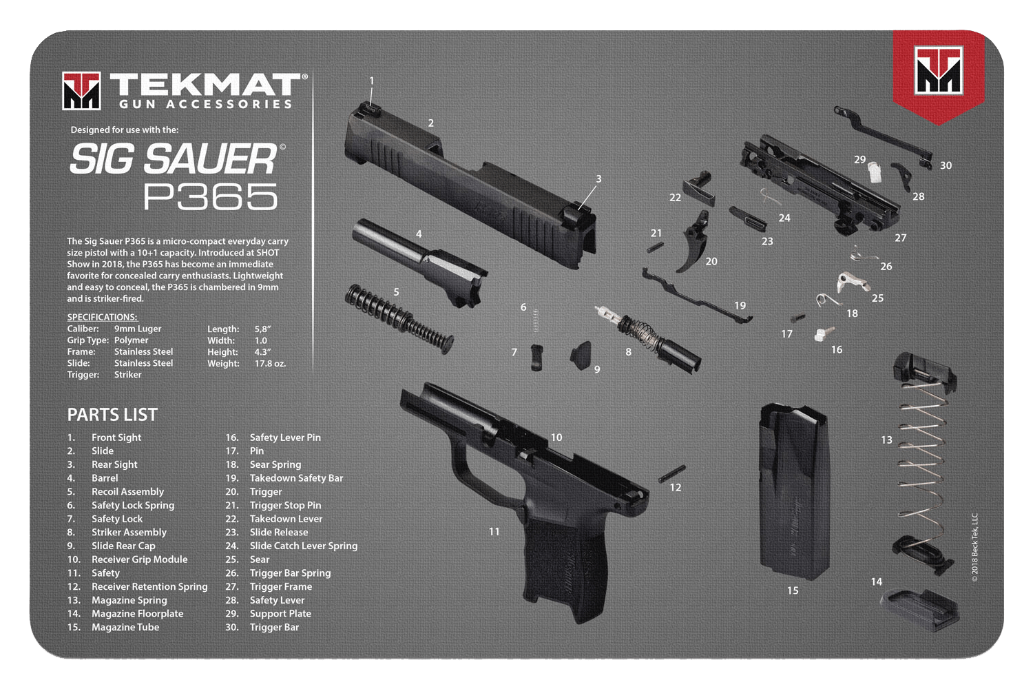 The 17" tekmats are large enough to handle a fully disassembled handgun with room to spare for tools and accessories.The 1/8" padding on these mats offers extra protection from any rough handling or drops while working on your firearm.The ultra-soft, oil and water-resistant surface helps protect your firearm from scratches while the diagrams and illustrations help with cleaning and disassembly.