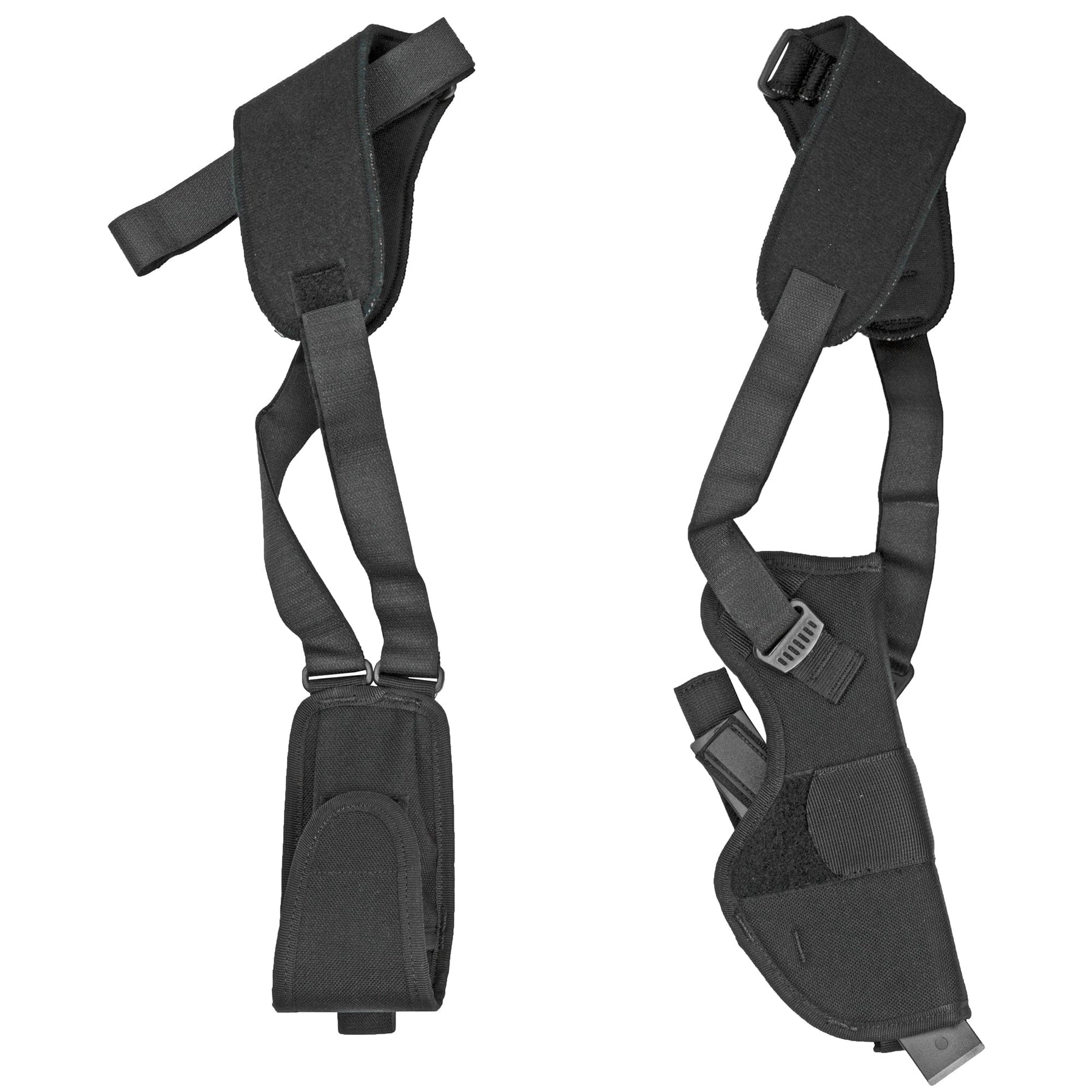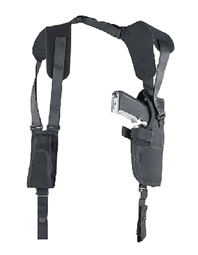 The vertical carry provides excellent concealment, comfort and retention, especially with large guns.It has a cordura nylon outer shell, and a unique finger break over triggerguard.You can adjust the holster vertically on all four straps and also adjusts horizontally between yokes.Elastic onside and offside tie-downs are adjustable and removable.Also, the offside tie-down has single magazine case or single speedloader case for autos and revolvers respectively.