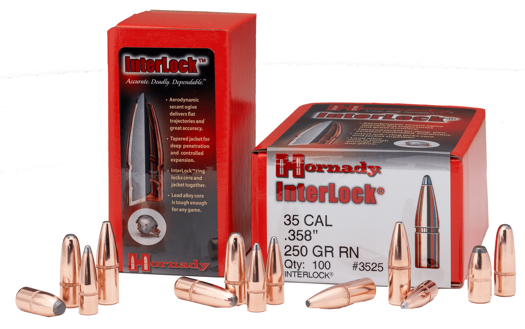 Hornady's interlock bullet features a raised ring inside the jacket that is embedded in the bullet's core that keeps the core and jacket locked together during expansion to retain mass and energy.The tapered jacket thickness is precisely controlled for expansion at all velocities, while its one-piece core does not separate.The cannelure provides accurate and consistent crimping and also works with the interlock ring to ensure the core and jacket remain locked during expansion.