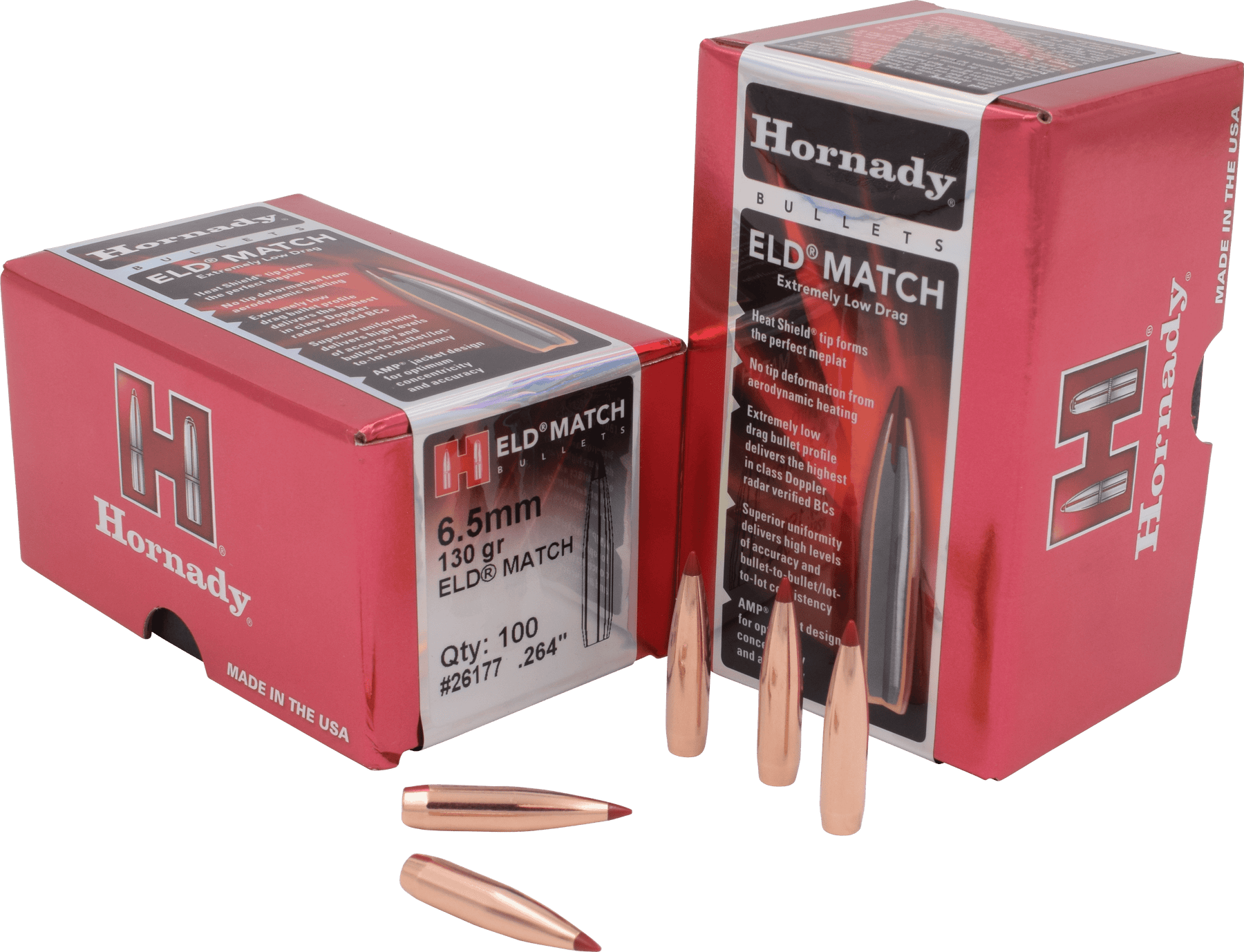 Hornady's eld match (extremely low drag match) bullets are technologically advanced, enhanced accuracy target bullets featuring heat shield tips with the ideal meplat (tip point) combined with numerous design features that deliver the highest-in-class ballistic coefficients, superior accuracy and extreme consistency from bullet to bullet, lot to lot.An optimum secant ogive and boattail design along with the heat shield tip produce a bullet with the highest possible ballistic coefficient in its class.The tip is immune to the effects of aerodynamic heating and retains its shape to provide a perfect meplat (tip) that is always the same shape.