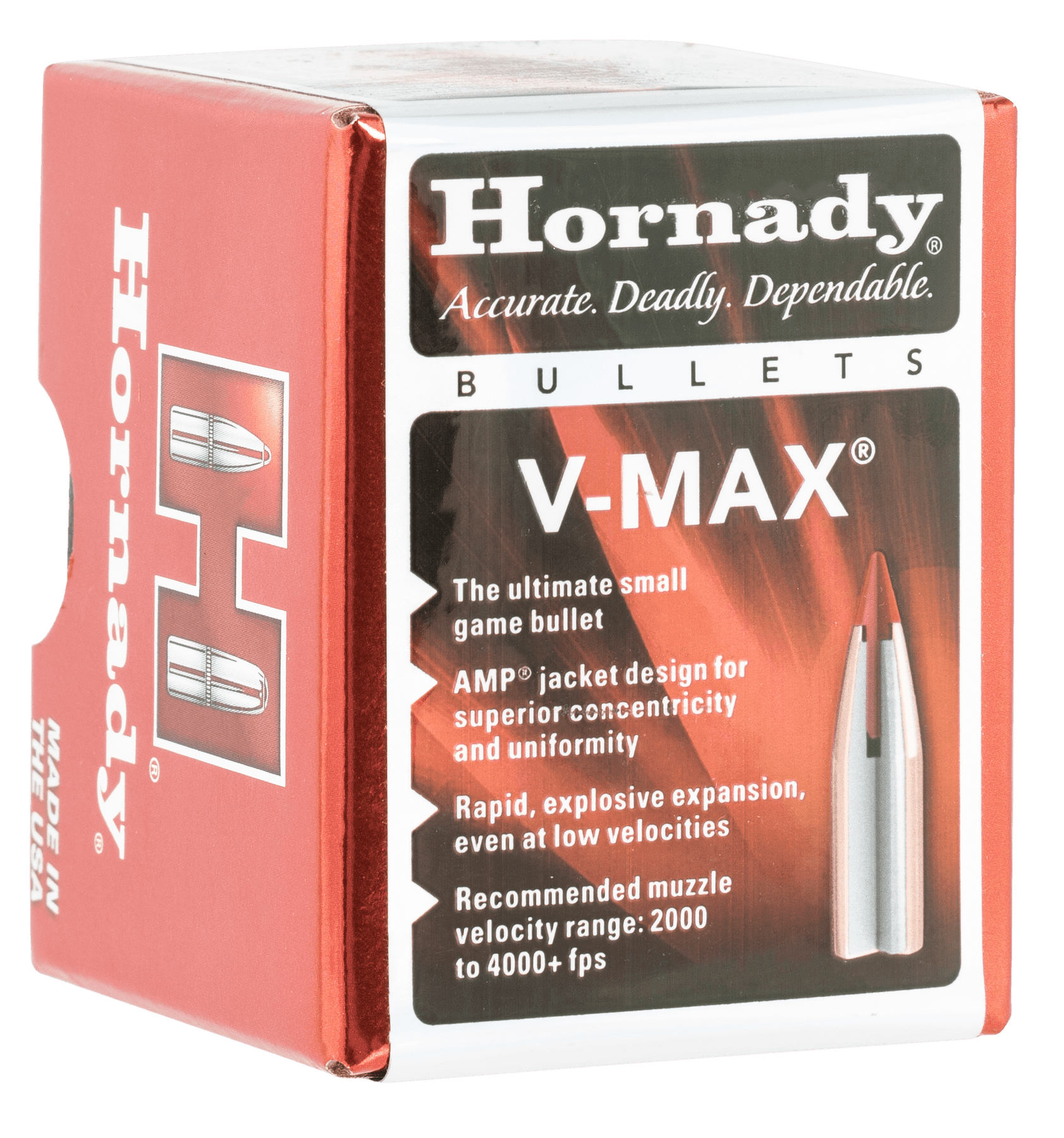 The dramatic fragmentation of the v-max bullet comes from a combination of the gilding metal jacket, specially designed core and polymer tip.The polymer tip and streamlined design results in flat trajectories, while the concentrically of the match grade jacket design provides maximum accuracy at all ranges as well as explosive expansion.