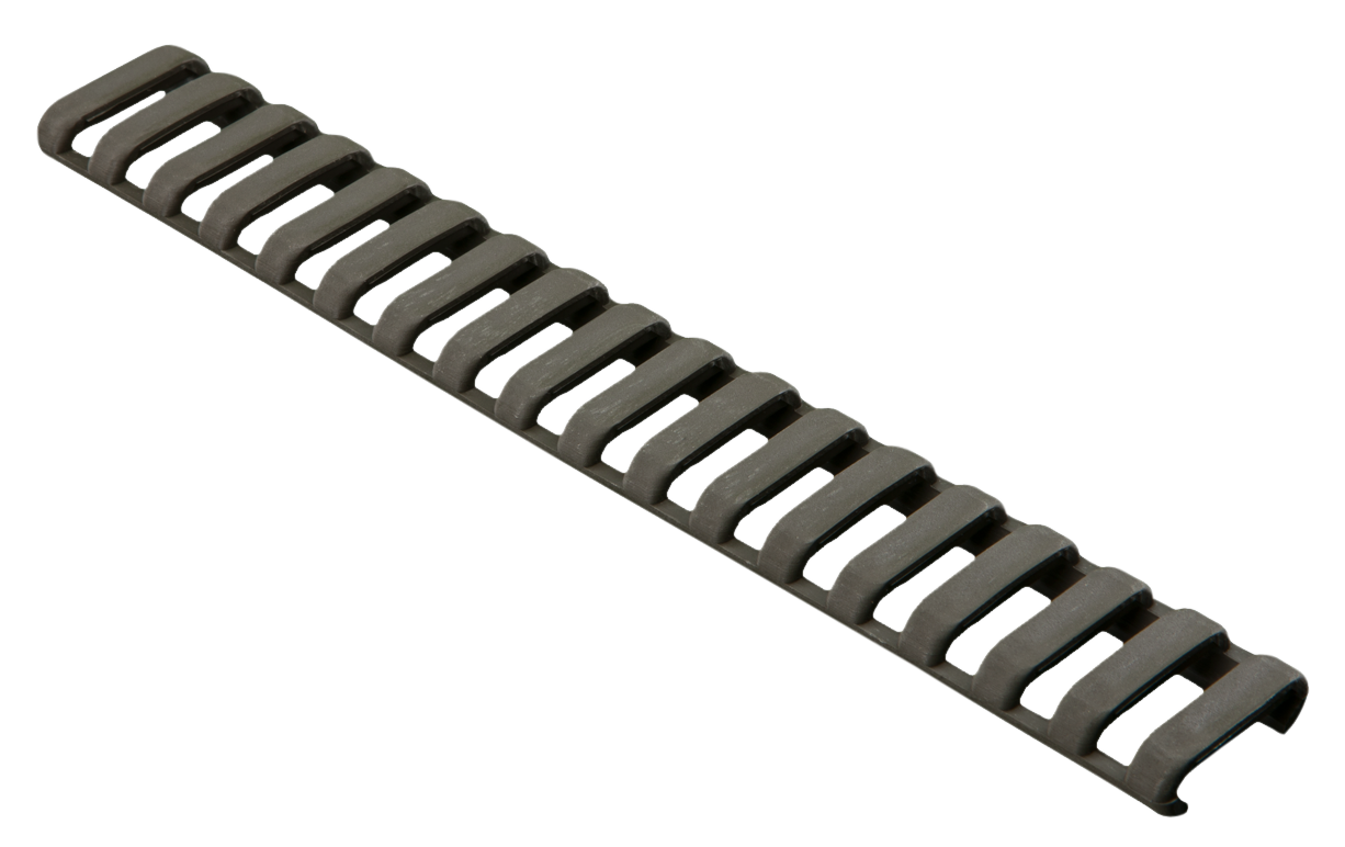 Ladder panels offer very low-profile 1913 picatinny rail coverage.The santoprene material provides a rubbery surface for improved weapon control and rail protection.Easily cut for custom lengths, each panel fits one side of a carbine-length rail (18 slots).One panel per package.