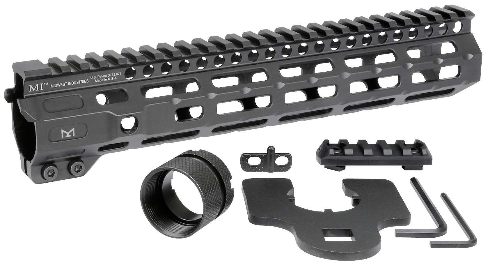 The combat m-lok handguard is constructed of 6061 aluminum with a continuous 1913 picatinny top rail, two integral anti-rotation qd sling sockets and seven sides of m-lok.It also utilizes a 4140 heat treated barrel nut, 4140 heat treated torque plate, and is fully dehorned and deburred.The handguard includes a barrel nut, wrench and 5-slot polymer m-lok rail.Made in usa.