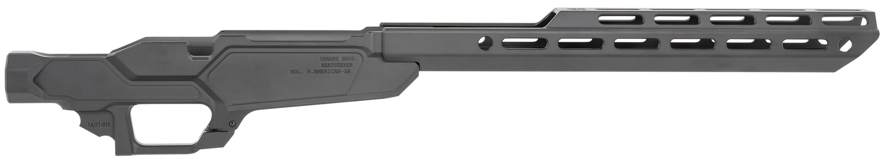 The sharps heatseeker is an innovative, affordable chassis system for your bolt action rifle, allowing you to easily upgrade a traditional factory rifle stock for improved versatility and a sleek, modern appearance.This sub 2 lb chassis is machined from billet high-strength 6061-t6 aluminum and includes a 10 ounce, 14" handguard cut from a unique extrusion shape exclusive to sharps bros.Both the chassis body and the handguard are finished in a matte black cerakote.The handguard features m-lok slots on 4 sides for various attachment options and two quick disconnect fittings per side for sling attachment.Add your pistol grip and stock of choice with the heatseeker's standard ar-15 grip and ar buffer interface.With heatseeker you can easily and affordably convert your bolt action rifle into an enhanced magazine fed system.Heatseeker's sleek contemporary design will completely transform the look of your rifle, with no need to visit a gunsmith: simplified instructions and functionality make installation a breeze.Heatseeker is compatible with aics short action magazines from magpul and accuracy international.