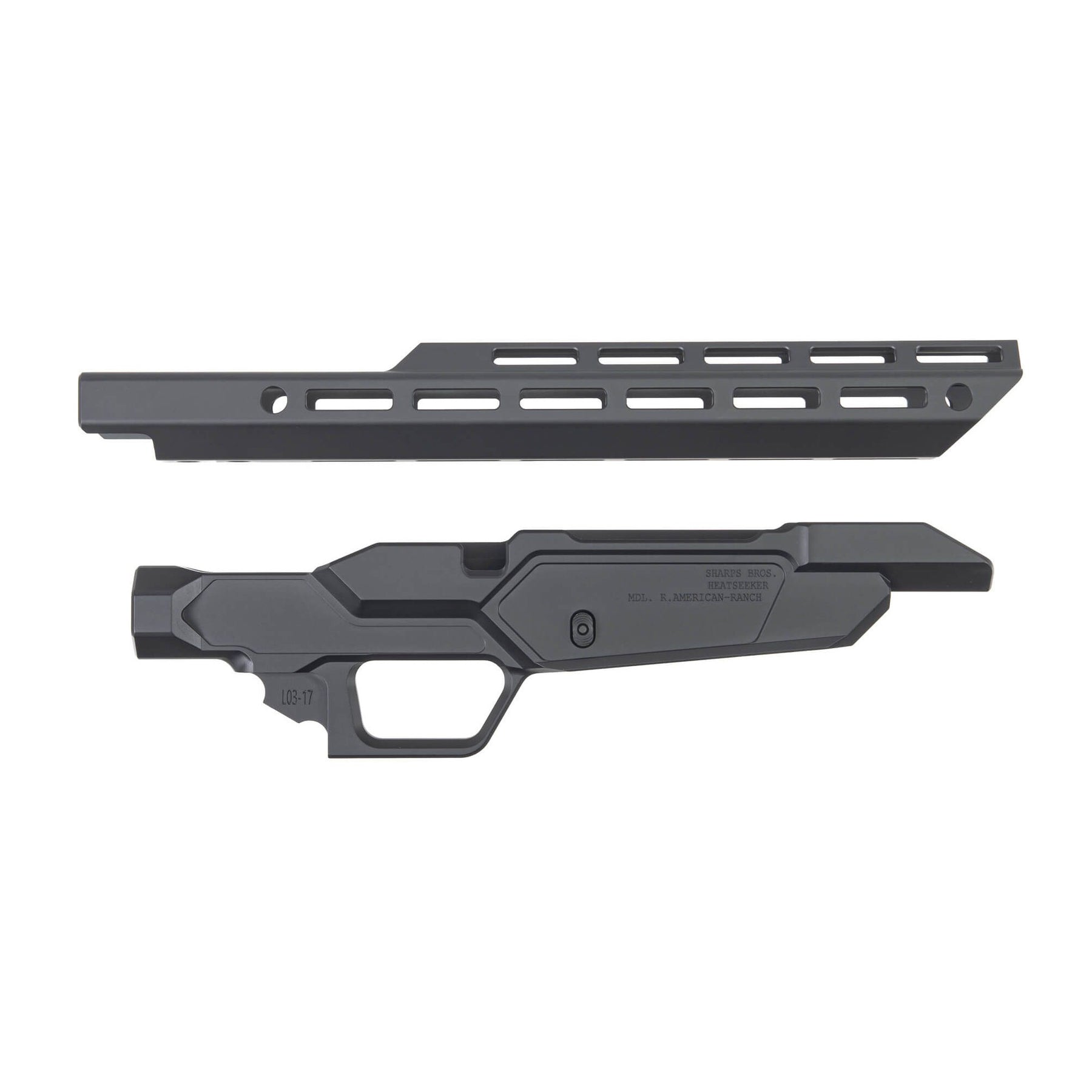 The sharps heatseeker is an innovative, affordable chassis system for your bolt action rifle, allowing you to easily upgrade a traditional factory rifle stock for improved versatility and a sleek, modern appearance.This sub 2 lb chassis is machined from billet high-strength 6061-t6 aluminum and includes a 10 ounce, 14" handguard cut from a unique extrusion shape exclusive to sharps bros.Both the chassis body and the handguard are finished in a matte black cerakote.The handguard features m-lok slots on 4 sides for various attachment options and two quick disconnect fittings per side for sling attachment.Add your pistol grip and stock of choice with the heatseeker's standard ar-15 grip and ar buffer interface.With heatseeker you can easily and affordably convert your bolt action rifle into an enhanced magazine fed system.Heatseeker's sleek contemporary design will completely transform the look of your rifle, with no need to visit a gunsmith: simplified instructions and functionality make installation a breeze.Heatseeker is compatible with aics short action magazines from magpul and accuracy international.This offering is for the ruger american ranch (calibers: 5.56/223, 300 blackout, 7.62x39, 6.5 grendel, 350 legend & 450 bushmaster).