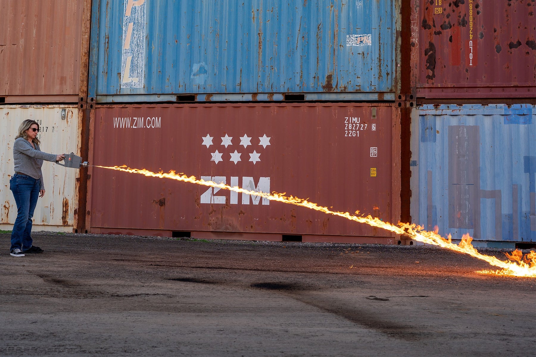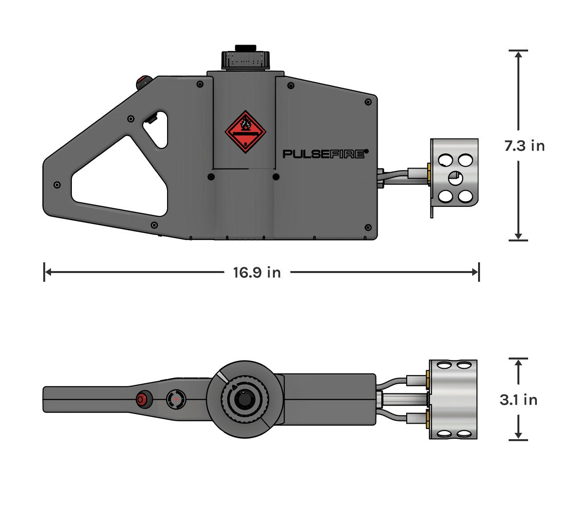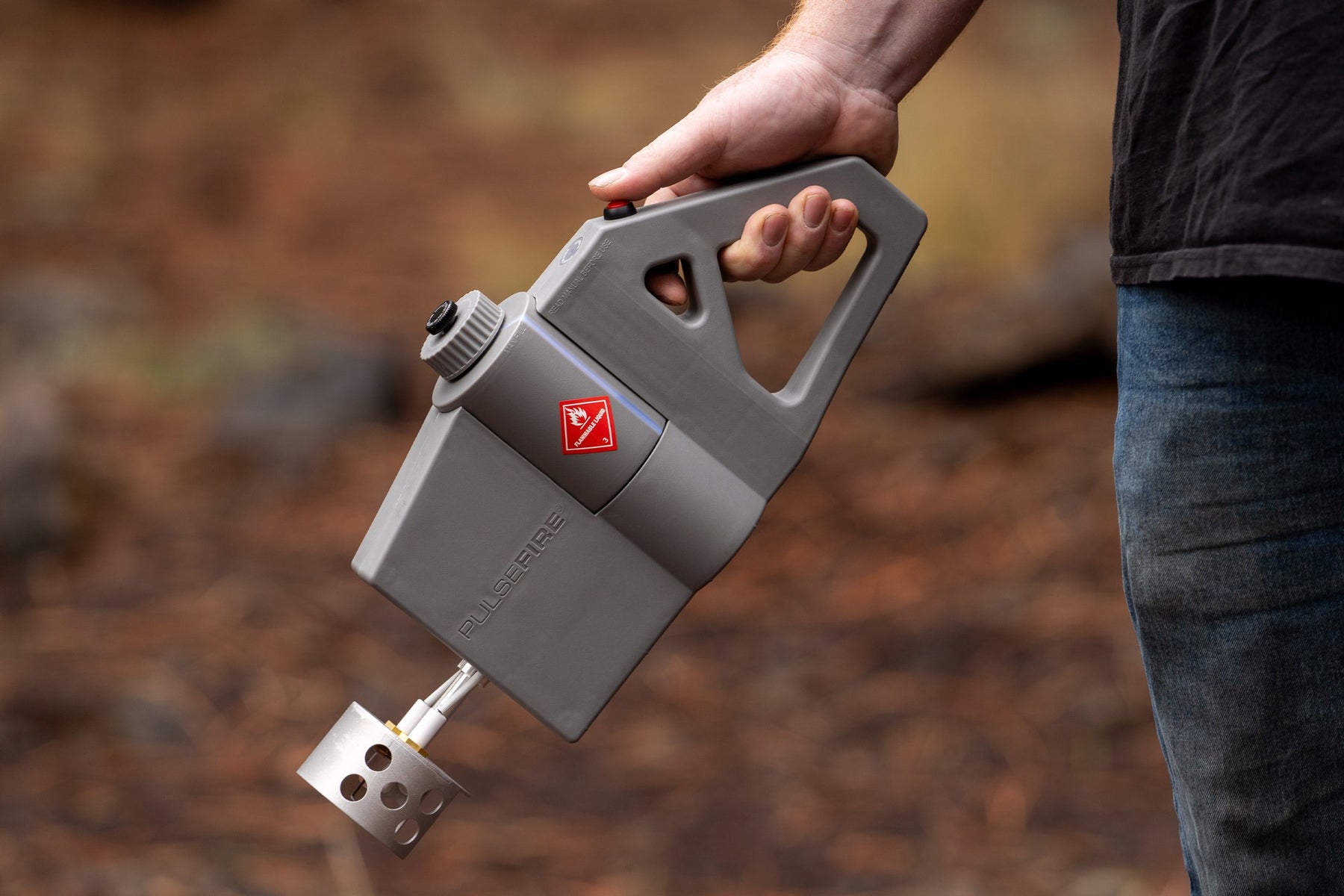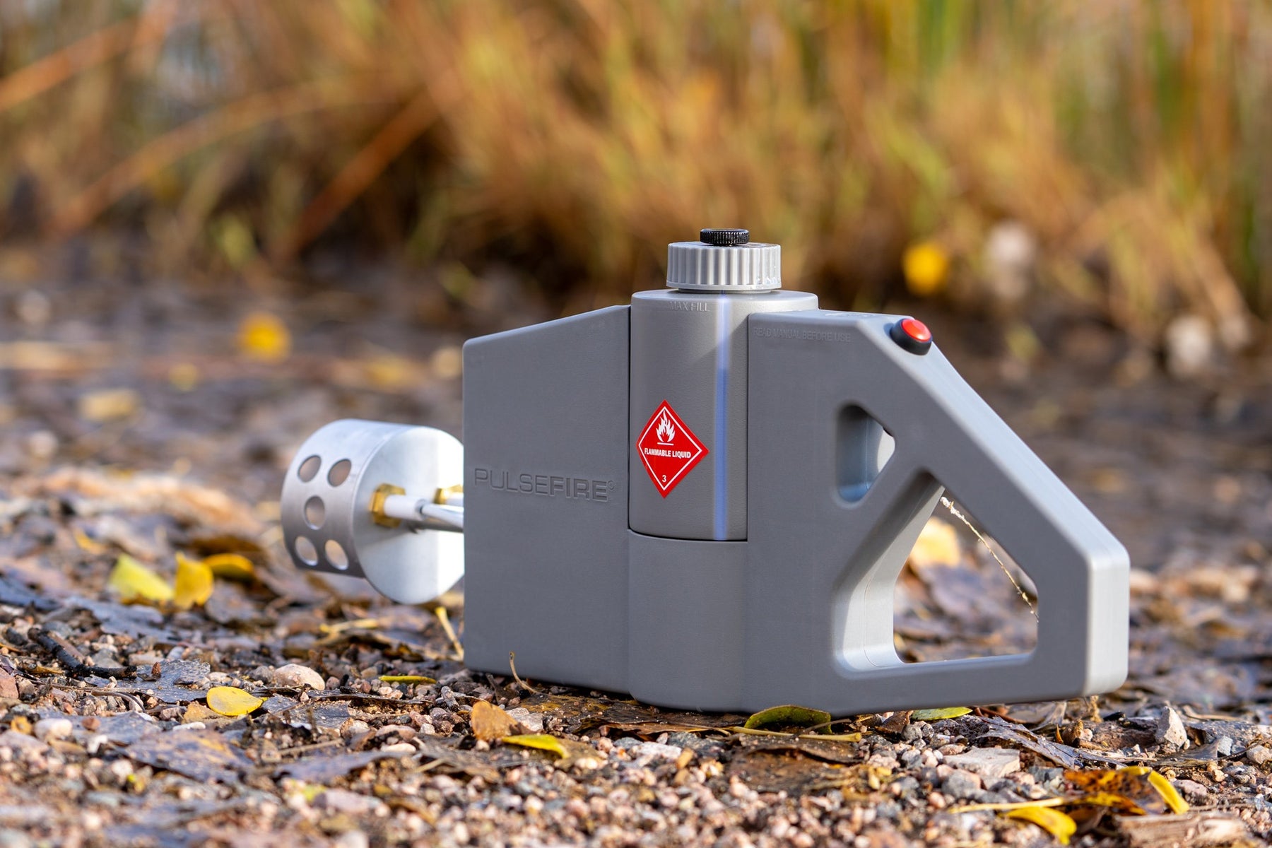 Pulsefire Compact is a compact, battery-powered ignited fuel-stream torch for outdoor tasks such as lighting a bonfire from a distance and spot-treating weeds and brush. It uses on-demand electric ignition and automatic valve control to deliver an ignited stream with a typical reach of up to 15 ft (4.5 m) under ideal conditions.