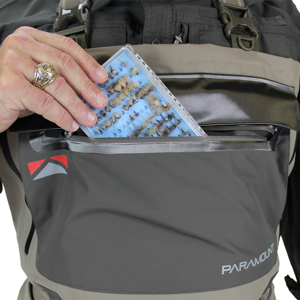 • 2 TOP ENTRY CHEST POCKETS with XL zippered fly box pocket plus hook and loop pocket