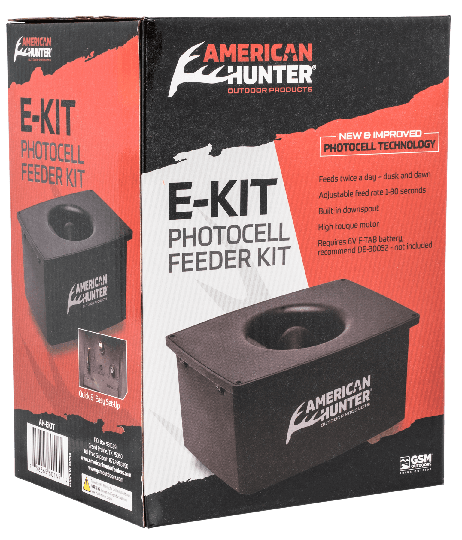 Feeder kit with photocell technology allows feeding at day light and again up to 12 hours later. Features an adjustable feed rate (1-30 sec), galvanized metal construction, a powder coated black metal downspout and a high torque motor. Operates on one 6 volt spring top battery (not included).
