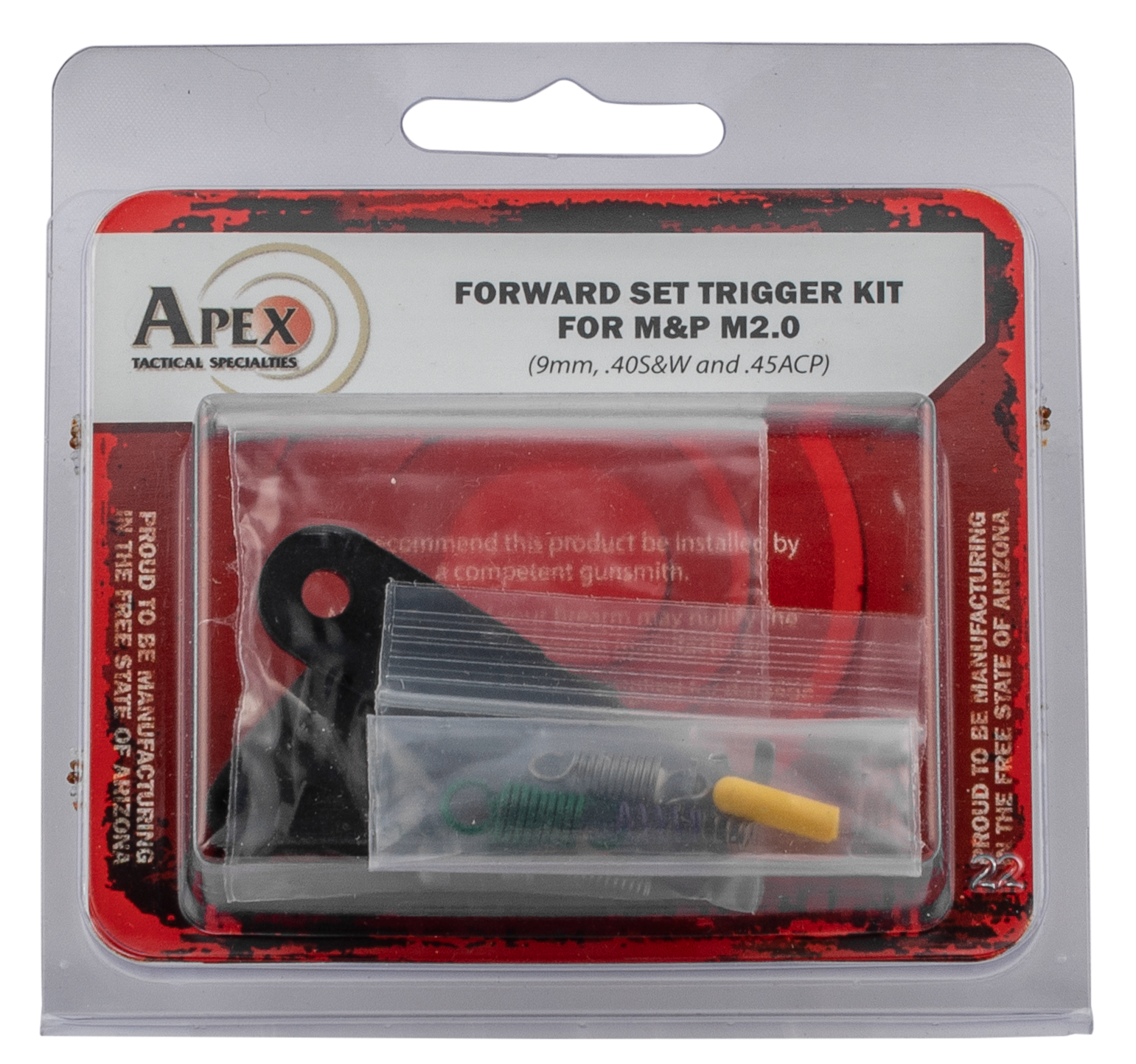 Apex's curved forward set trigger kit is engineered to provide the m&p m2.0 pistol owner with a smooth, consistent trigger pull with the advantages of shorter over-travel and shortened trigger reset.All of the components work together to provide a pull weight within the acceptable range for a top end, service pistol.The kit itself is designed to be drop-in and should not require further gunsmithing, however, armorer or gunsmith installation is recommended.It is compatible with smith & wesson m&p m2.0 pistols in 9mm,.40s&w and.45acp calibers.It does not function in the original m&p or m&p shield models.The kit includes: black anodized curved forward set trigger, apex forward set sear actuator, apex fully machined 2-dot sear, ultimate striker block kit (striker block, spring and talon tactical tool), and forward set spring kit for m2.0: heavy sear spring (purple), duty/carry sear spring (silver), heavy trigger return spring (green), duty/carry trigger return spring (silver) and polymer slave pin for 11 total pieces in the package.