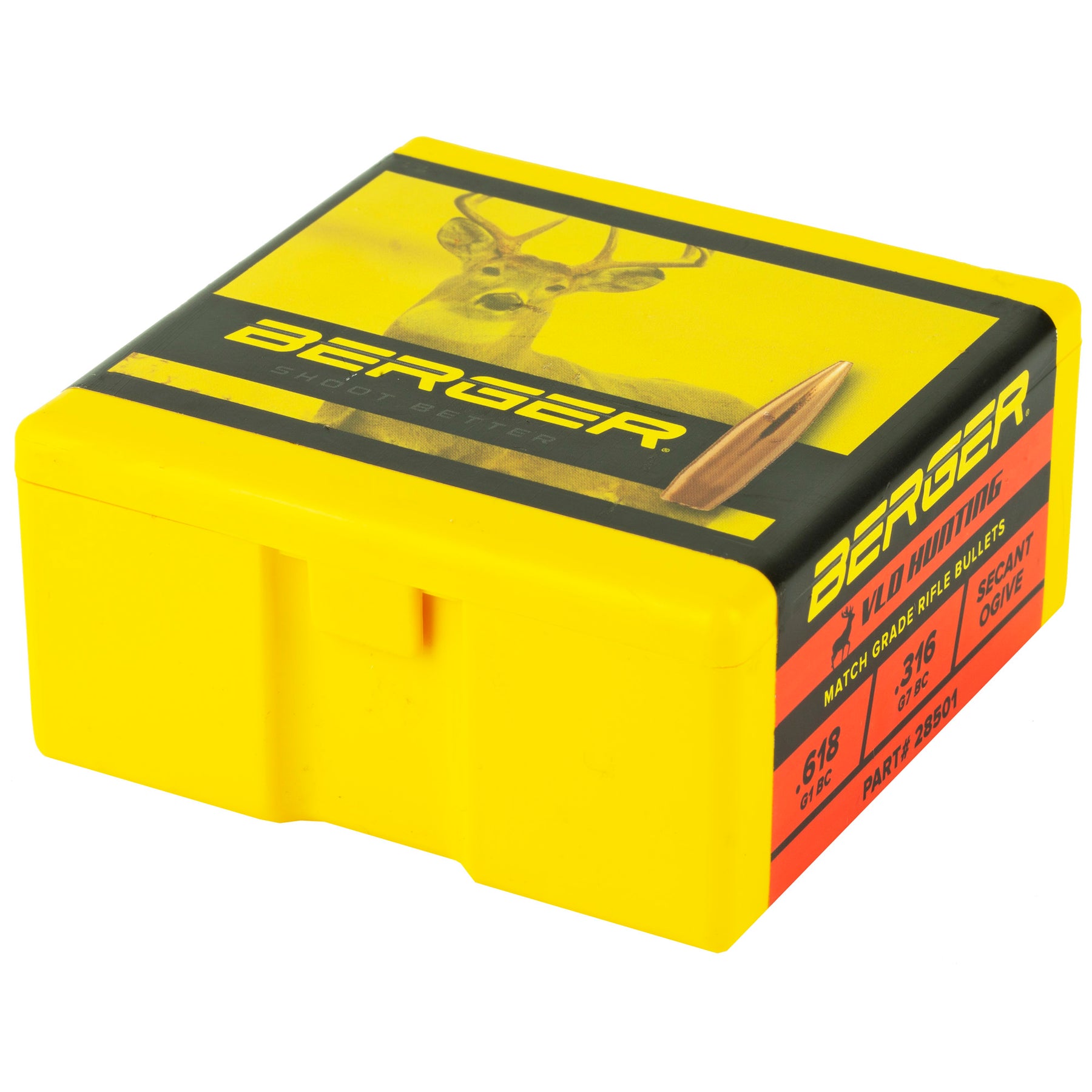 The berger vld hunting bullet is one of the flattest shooting hunting bullets in the industry.Vld hunting bullets are identical in design to vld target bullets except utilize a thinner j4 precision jacket for rapid expansion during game applications.Vld hunting bullets are designed to penetrate 2-3 and then begin to expand and create a massive wound cavity up to 15.The hydrostatic shock causes most animals to drop immediately.Vld hunting bullets incoporate a secant ogive design which allows the bullet to experience less drag as it travels to the target.This reduced drag is why the vld shoots flatter, experiences less wind-drift, and has a higher retained velocity than all others.A favorite load technique for the vlds is touching the rifling for single-shot applications, although some rifles may prefer as much as.150 from the rifling.Berger vld hunting bullets are extremely popular for long range hunting applications.Built with highly consistent j4 precision bullet jackets, most favored by custom bullet makers.