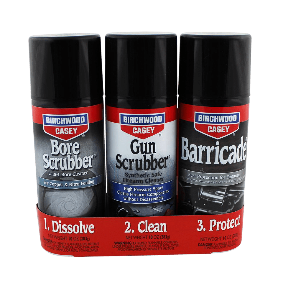 1-2-3 Aerosol Value Pack - Gun cleaning made simple. 3 easy steps to clean your firearm: dissolve, clean and protect. First, use Bore Scrubber to dissolve copper fouling and residue left behind from firing your firearm. Second, clean out the dissolved material with Gun Scrubber. And, third, cover with Barricade® to protect your firearm from rusting. PLEASE NOTE: This item cannot be shipped to an address within the State of California.