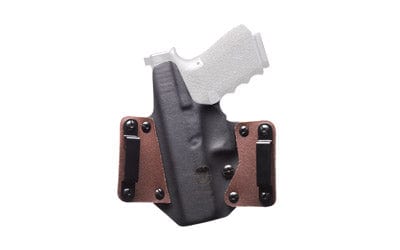 The Leather WING(TM) holster by BlackPoint Tactical is a naturally evolved version of the original KYDEX(R) holster. The Leather WING(TM) is designed to retain the most popular features of a KYDEX(R) holster, while improving the fit of the holster to the body through the addition of leather wings. These wings allow the holster to wrap and fit the contours of the waist. The seamless integration of leather and KYDEX(R) allows for the retention and function of a traditional KYDEX(R) holster, while providing the comfort of a traditional leather holster. The Leather WING(TM) allows the holster to naturally curve with the body, giving a much slimmer and more comfortable fit. This configuration allows for ultimate comfort, reliability, and concealment.