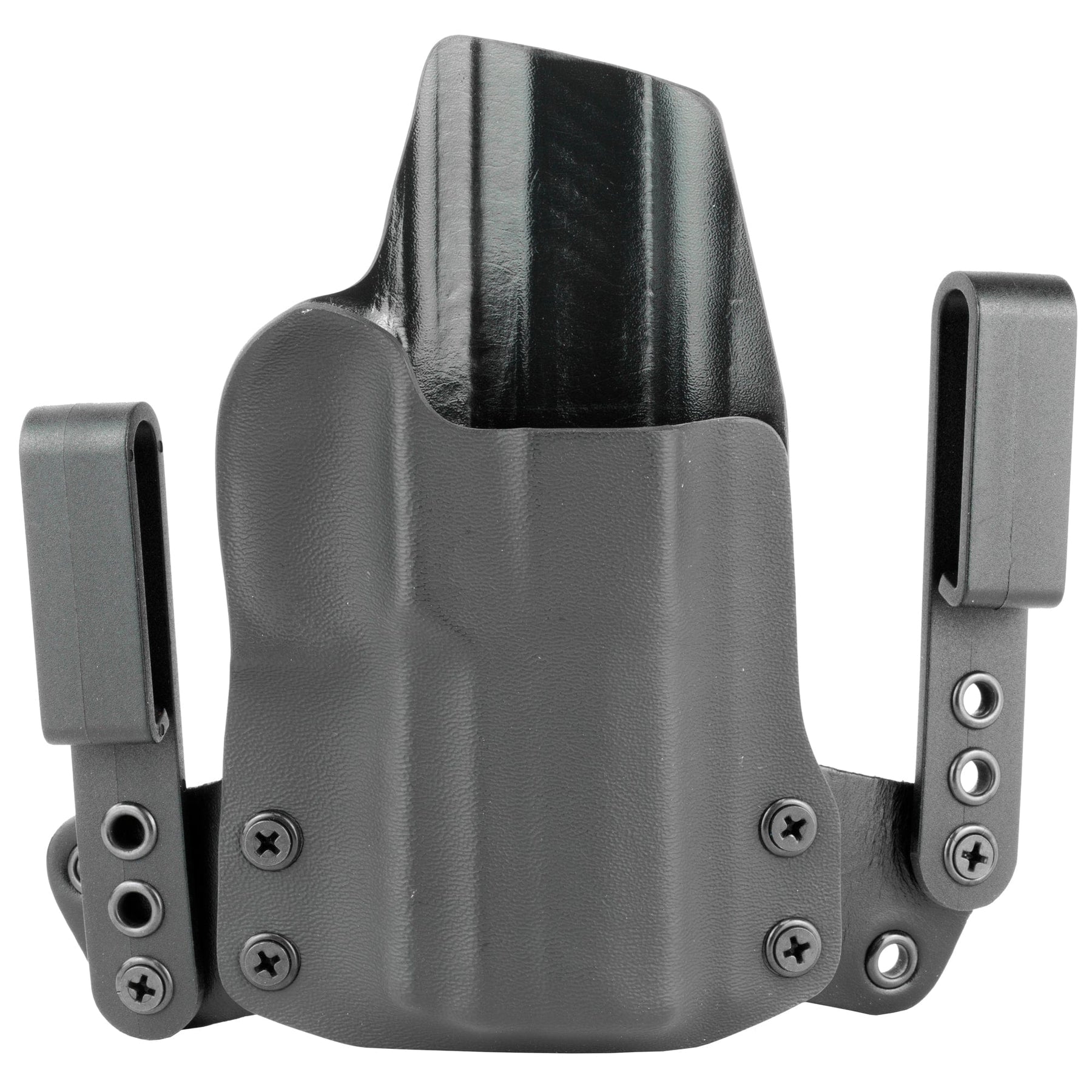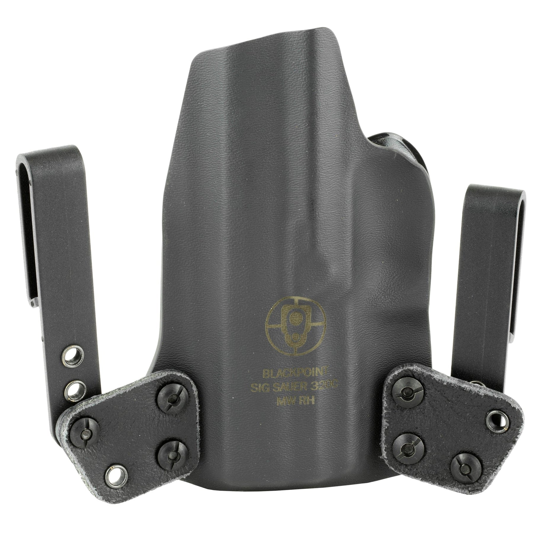 The Mini WING(TM) by BlackPoint Tactical is designed to be a minimized IWB holster which allows the user to carry comfortably all day long without sacrificing performance or durability. The pairing of KYDEX(R) and leather on this holster provides the functional benefits of a KYDEX(R) holster while providing the flexibility and comfort of a leather holster. The KYDEX(R) reliably retains your pistol without a break in or wear out period and it prevents the holster from collapsing when your pistol is drawn for easy one handed holstering. The mini wings give the holster flexibility to move with your body, making it comfortable for use all day, every day. Additionally, the mini wings were constructed to provide the user with a variety of different configurations for IWB carry with adjustments available to the cant and ride height of the holster.