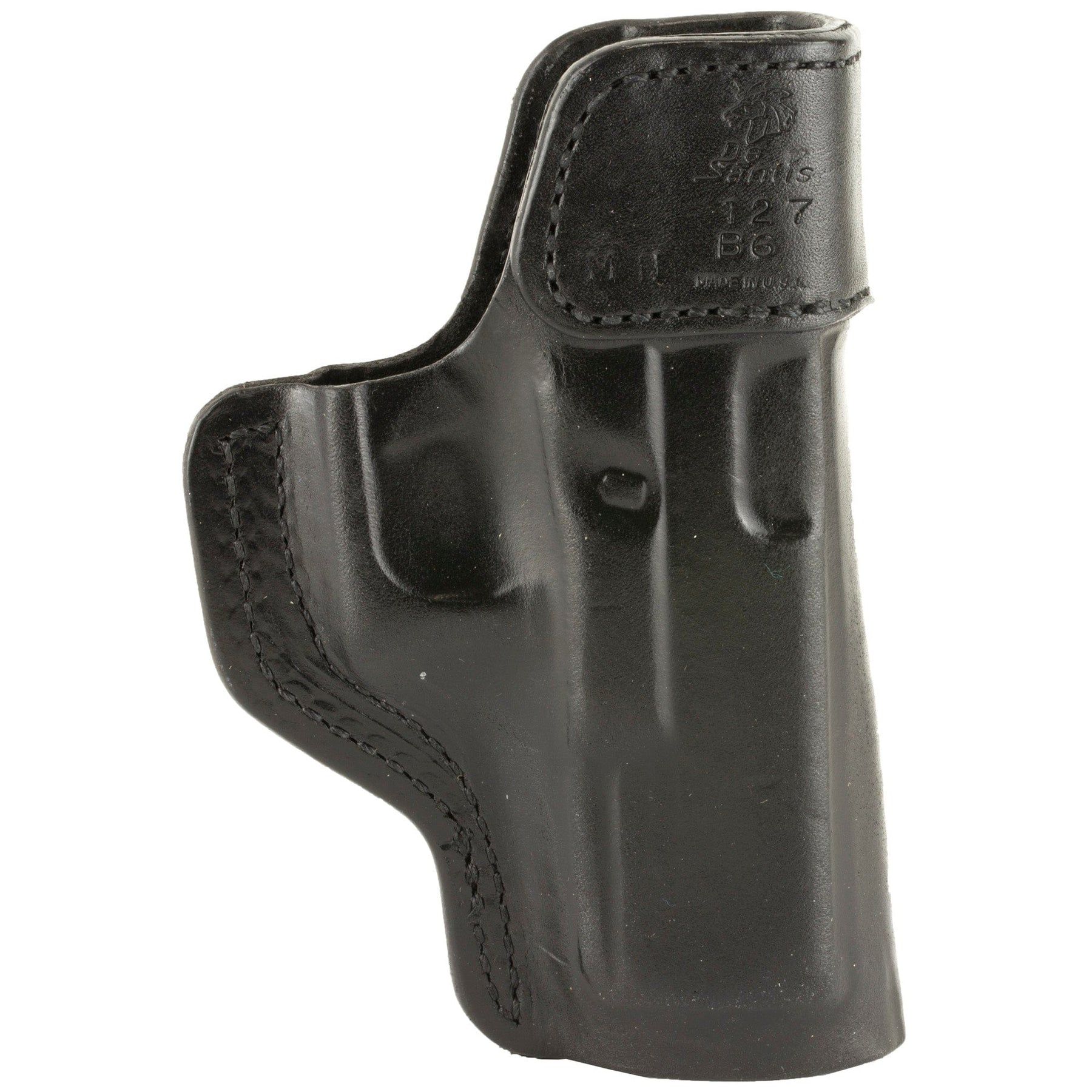 The Inside Heat(TM) is a bare bones minimum IWB holster built from black saddle leather. The precise molded contours provide the weapon retention. The top is reinforced to ease re-holstering and the powder coated spring clip holds it securely to your belt. It is only available in black saddle leather.