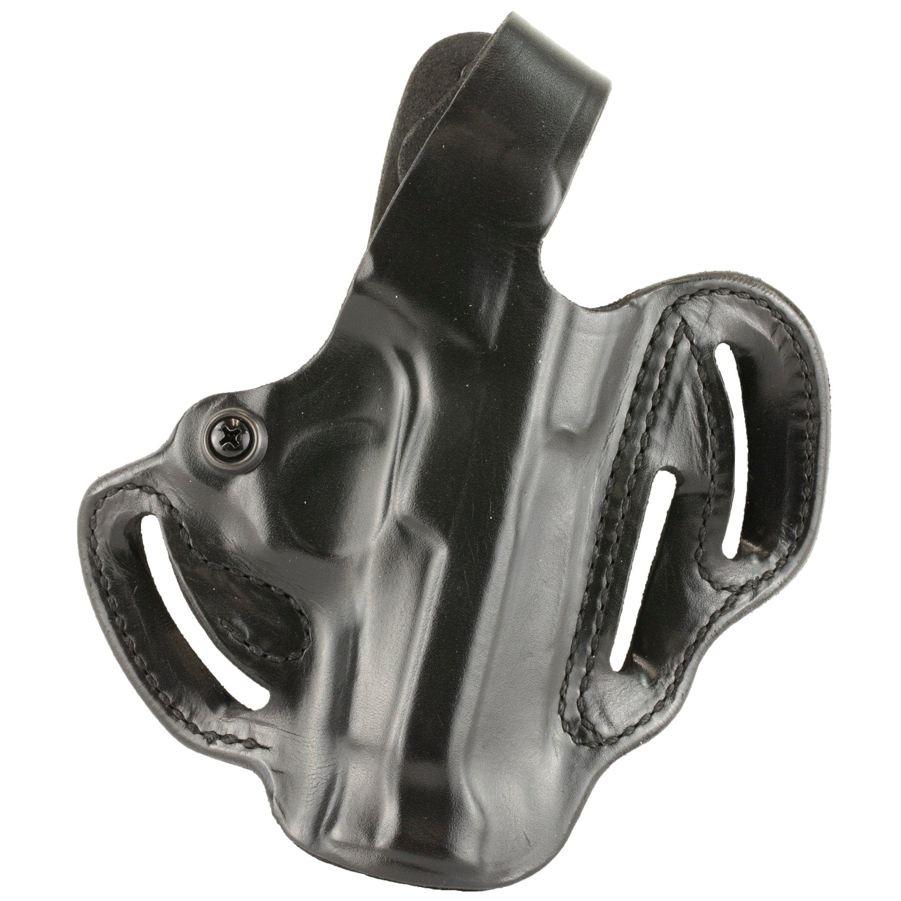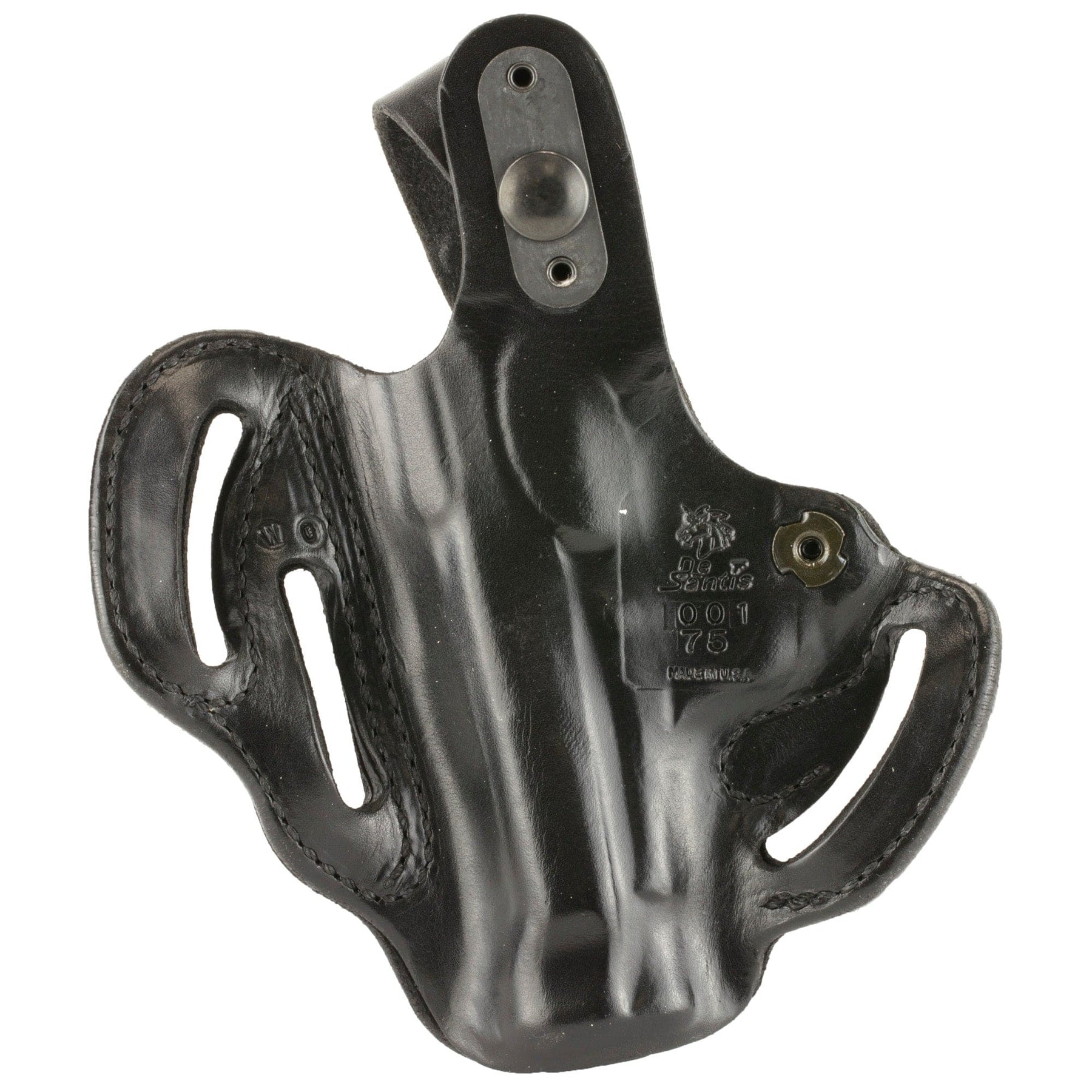 The firearm rides high and is presented at an optimum draw angle. Its thumb break and exact molding, together with a tension device, allows for a secure and highly concealable carry. Belt slots are 1 3/4" wide. Some models with two belt slots and without tension device.