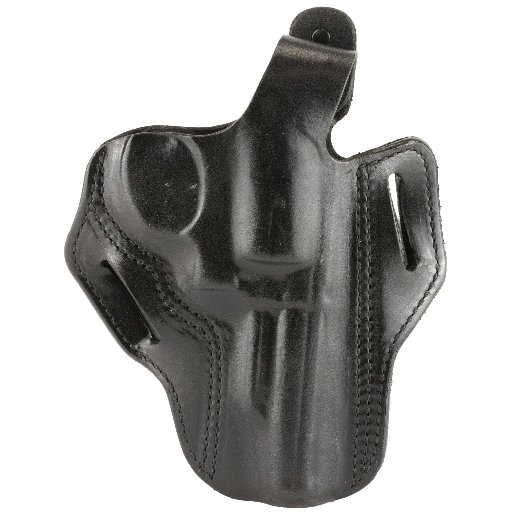 The firearm rides high and is presented at an optimum draw angle. Its thumb break and exact molding, together with a tension device, allows for a secure and highly concealable carry. Belt slots are 1 3/4" wide. Some models with two belt slots and without tension device.