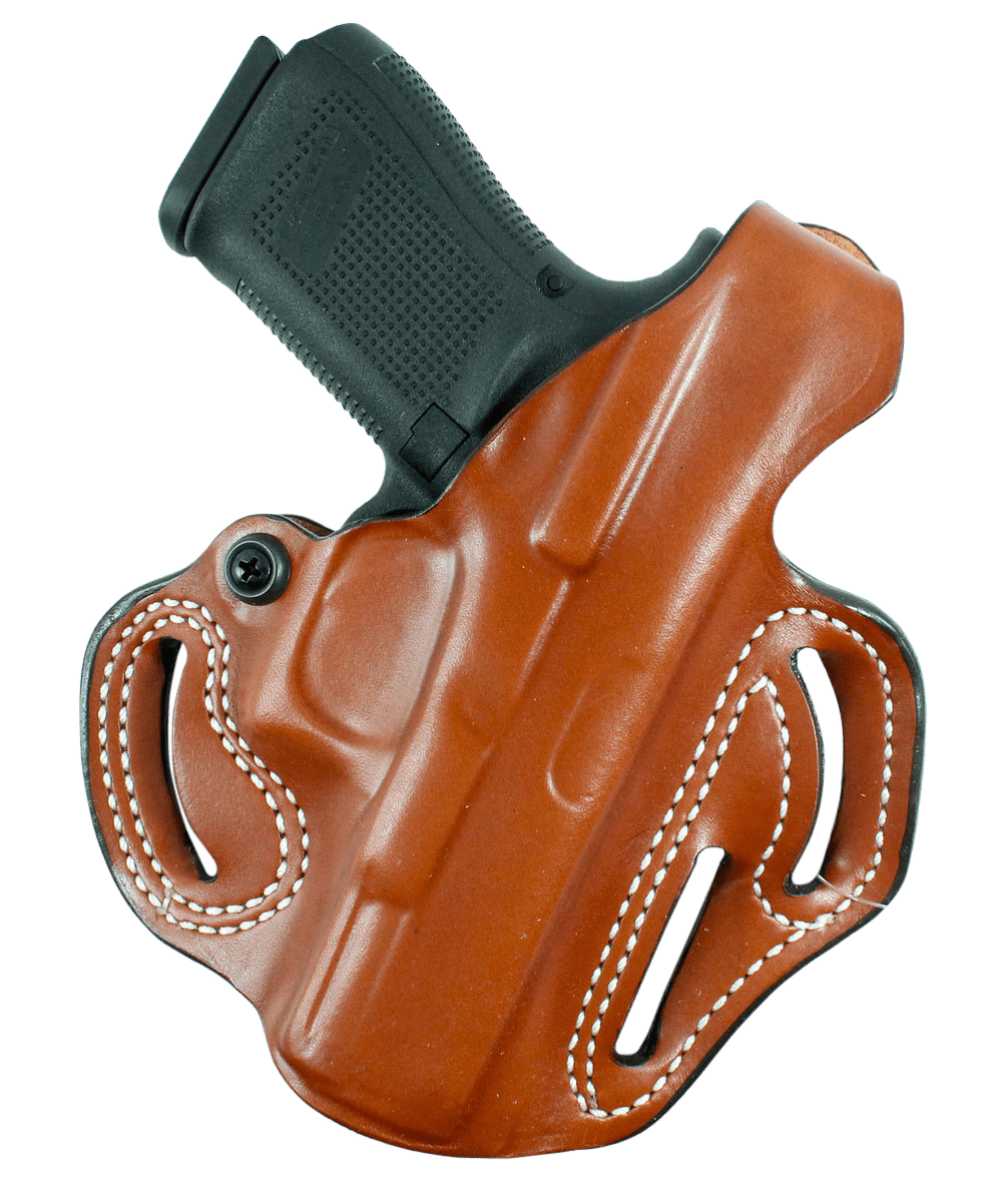 The firearm rides high and is presented at an optimum draw angle.Its thumb break and exact molding, together with a tension device, allows for a secure and highly concealable carry.This picture illustrates the three-slot model.Belt slots are 1 3/4" wide.