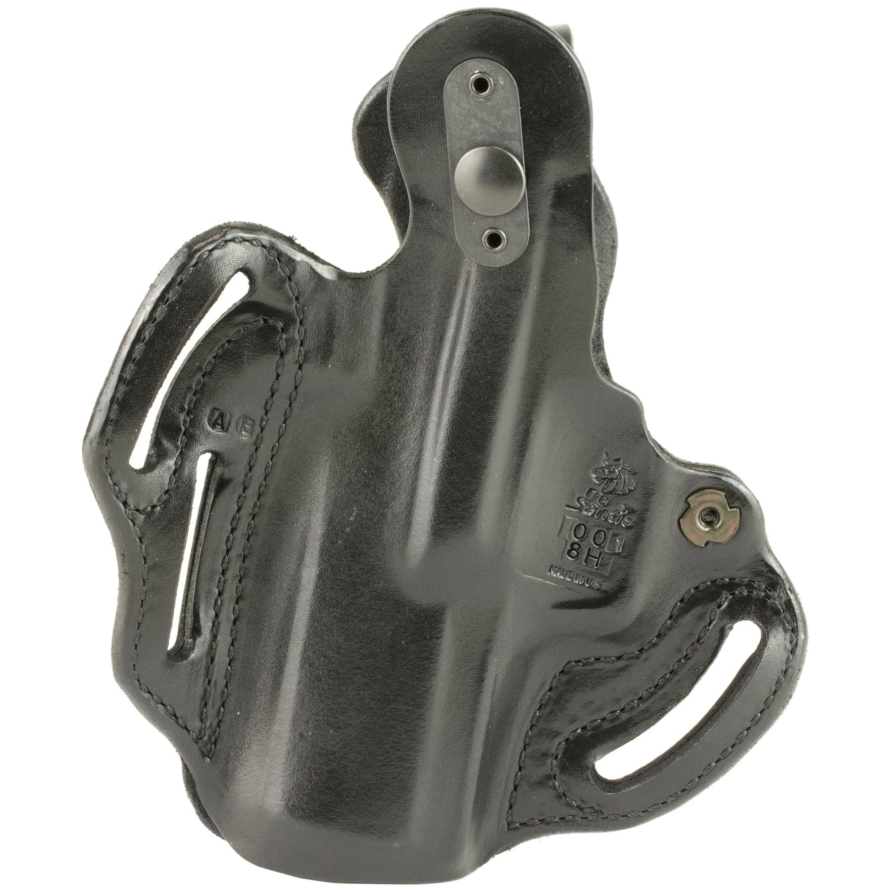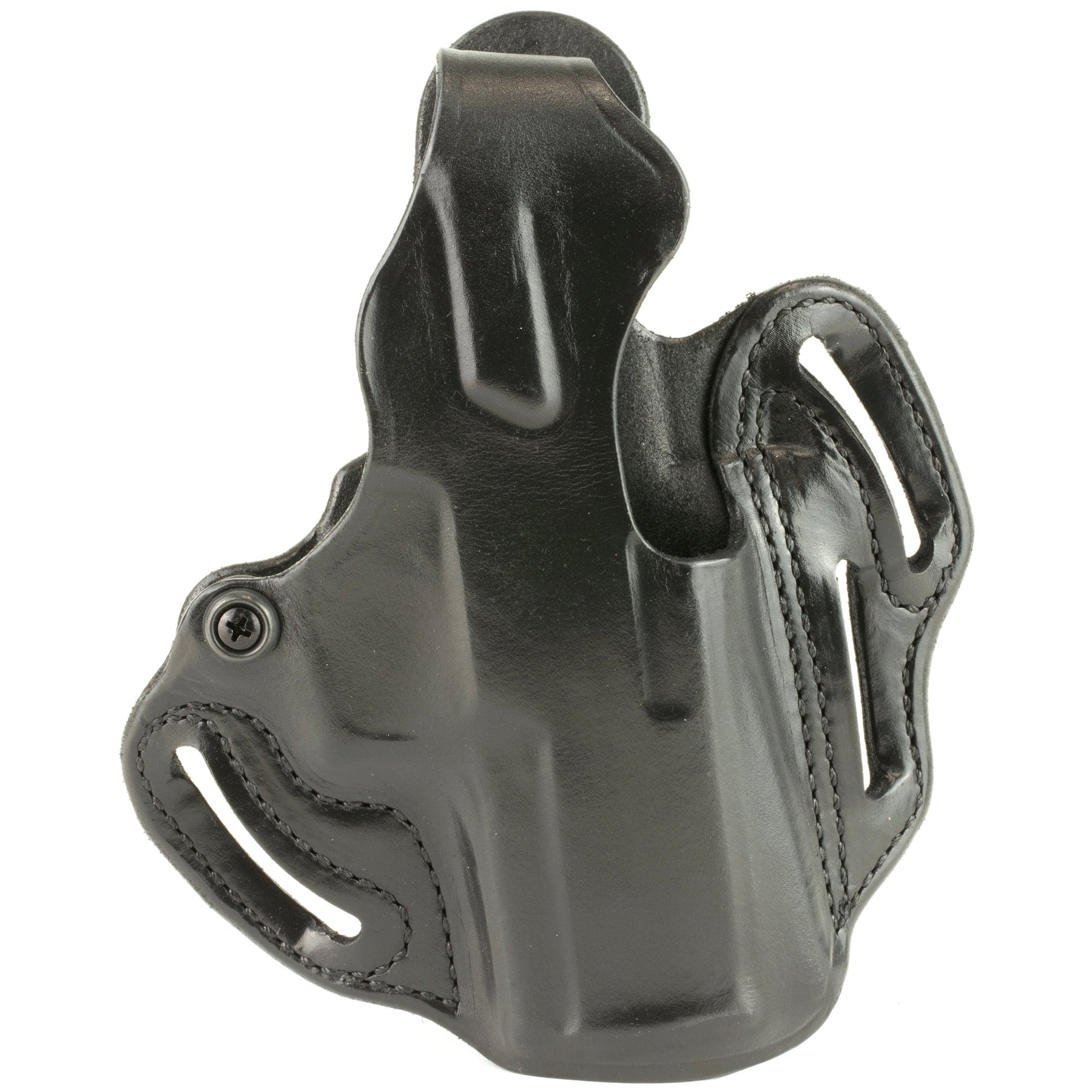 The firearm rides high and is presented at an optimum draw angle. Its thumb break and exact molding, together with a tension device, allows for a secure and highly concealable carry. Belt slots are 1 3/4" wide. Some models with two belt slots and without tension device.