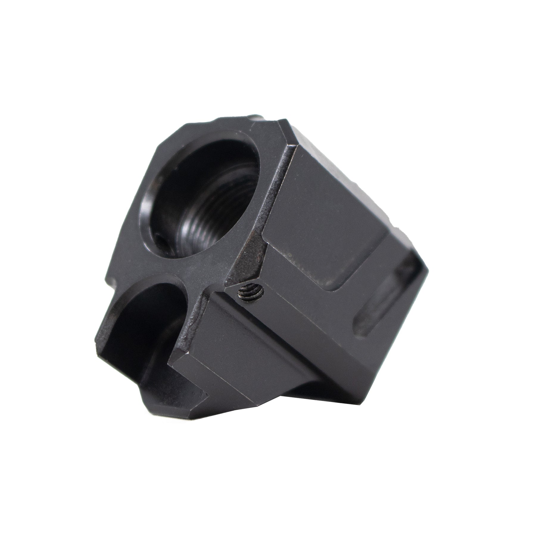 Constructed of 6061 aluminum with a black anodized finish, faxon pistol compensators feature a uniquely angled front port single chamber design, enabling the compensator to improve consistency while reducing muzzle climb and recoil.The angled ports allow gas to deflect upwards as opposed to only deflecting sideways, reducing up and down muzzle movement and improving reliability.Barrel protrusion is designed to fit flush with the slide and has been optimized for faxon branded barrels.For all other barrels, the barrel should protrude.600 or less for a flush fit.Each compensator comes complete with thread locker, two 6-32 set screws, and a 1/16 allen wrench.