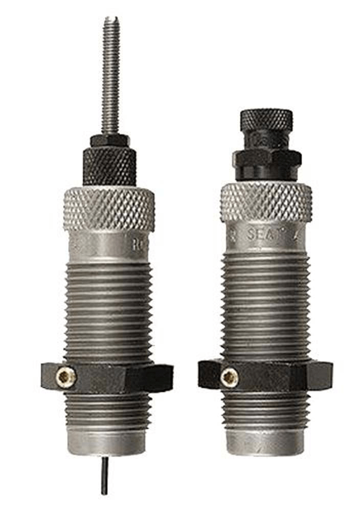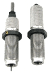 This two-die set is intended for reloading bottleneck cases, and consists of a full-length sizer die with an expander-decapping unit, and a seater die with bullet seater plug.The full-length sizer die brings the case to saami minimum cartridge dimensions.It sizes the outside of the case, de-primes and expands the neck to accept the bullet.The die has vents to prevent case damage caused by trapped air and for excessive lubricant.Headspace is held to minimum tolerances to avoid changing the case body length during full length sizing.The included seater die has a built-in roll crimper to secure the bullet at the same time as it's seated.
