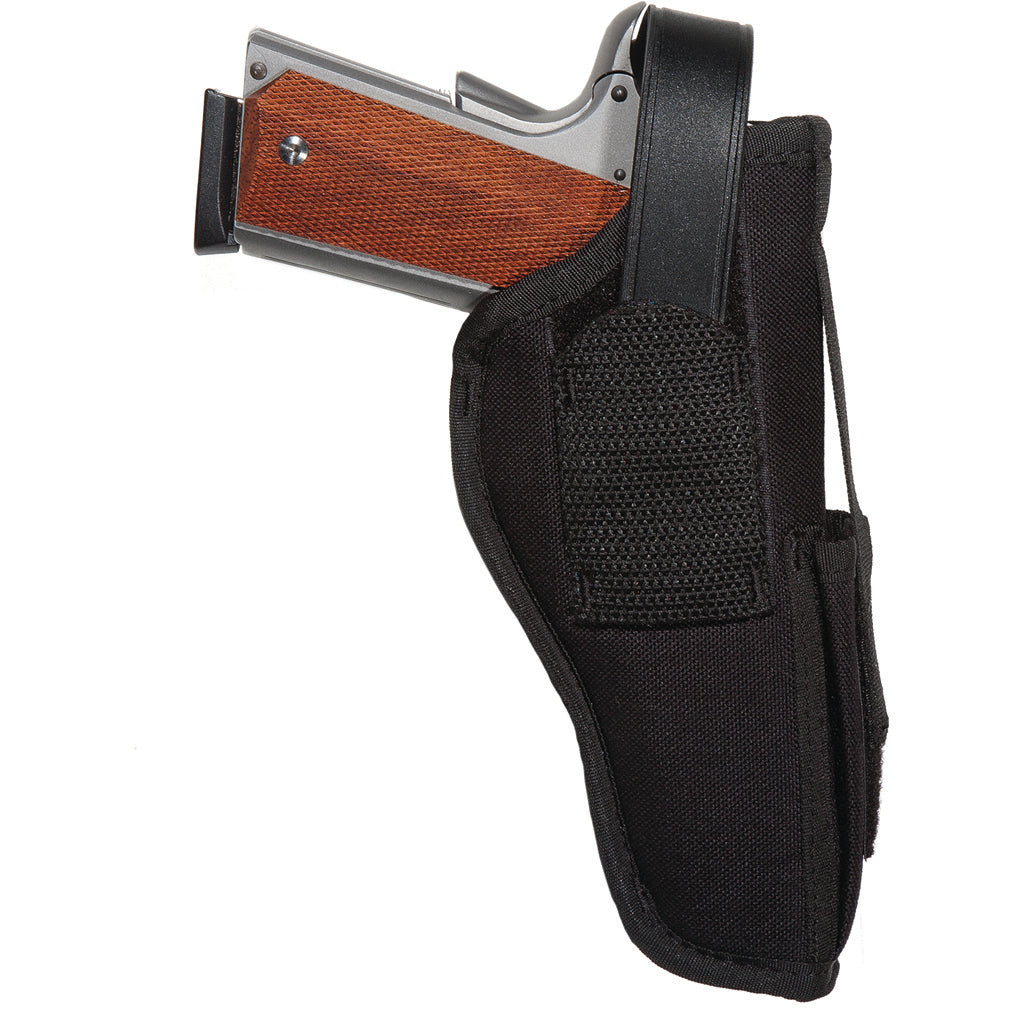 The sidekick hip holster is a versatile holster with magazine pouch and removable belt clip.The velcro retaining strap secures magazine yet provides easy access.It is constructed of tough, patented sidekick laminate of cordura nylon, waterproof closed cell foam padding and smooth nylon lining.The non-stretch retention strap and molded thumb break are anchored by one-way velcro inside of the strap trap.Adjustment tool included.This model is compatible with your 4.5-5" barrel large auto.